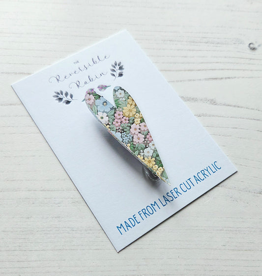 Long Heart Brooch, mirrored acrylic with pastel spring floral