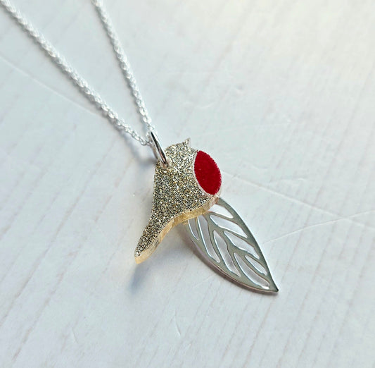 Robin and Leaf Pendant, Yellow Gold Vermeil, Limited edition Champagne shimmer