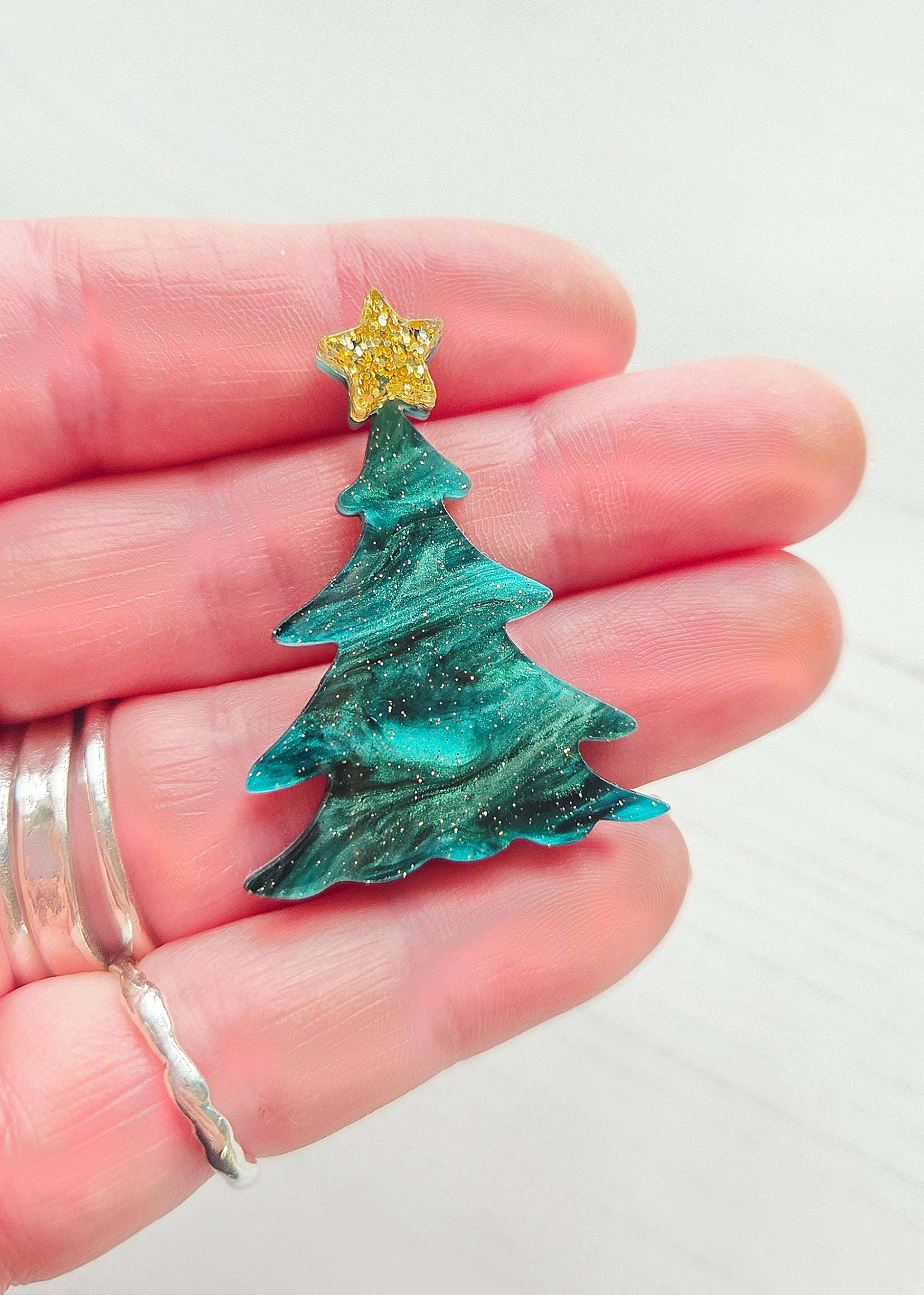 Fun eye catching Christmas Tree Brooch/pin made with dark green metallic swirl acrylic topped with a gold glitter star