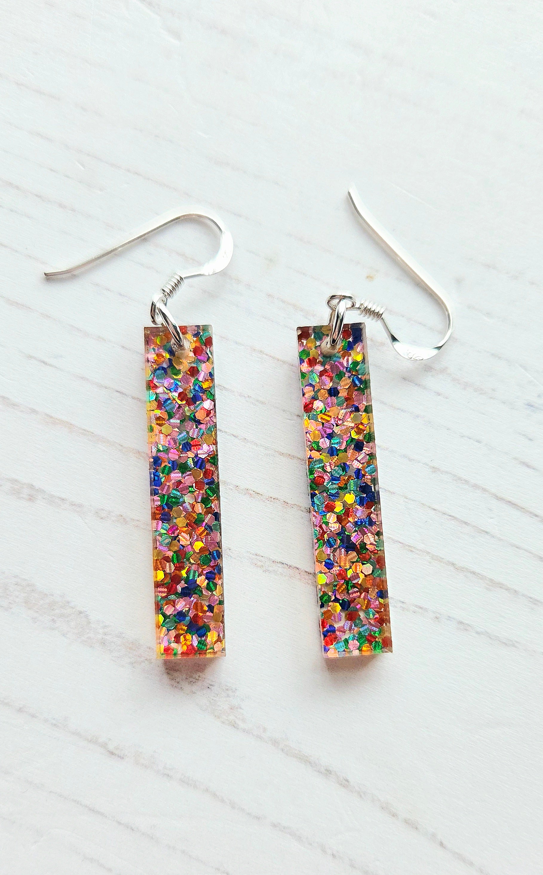 Gorgeous fun and bright rainbow dot acrylic ingot drop earrings with sterling silver hooks, perfect for any occasion