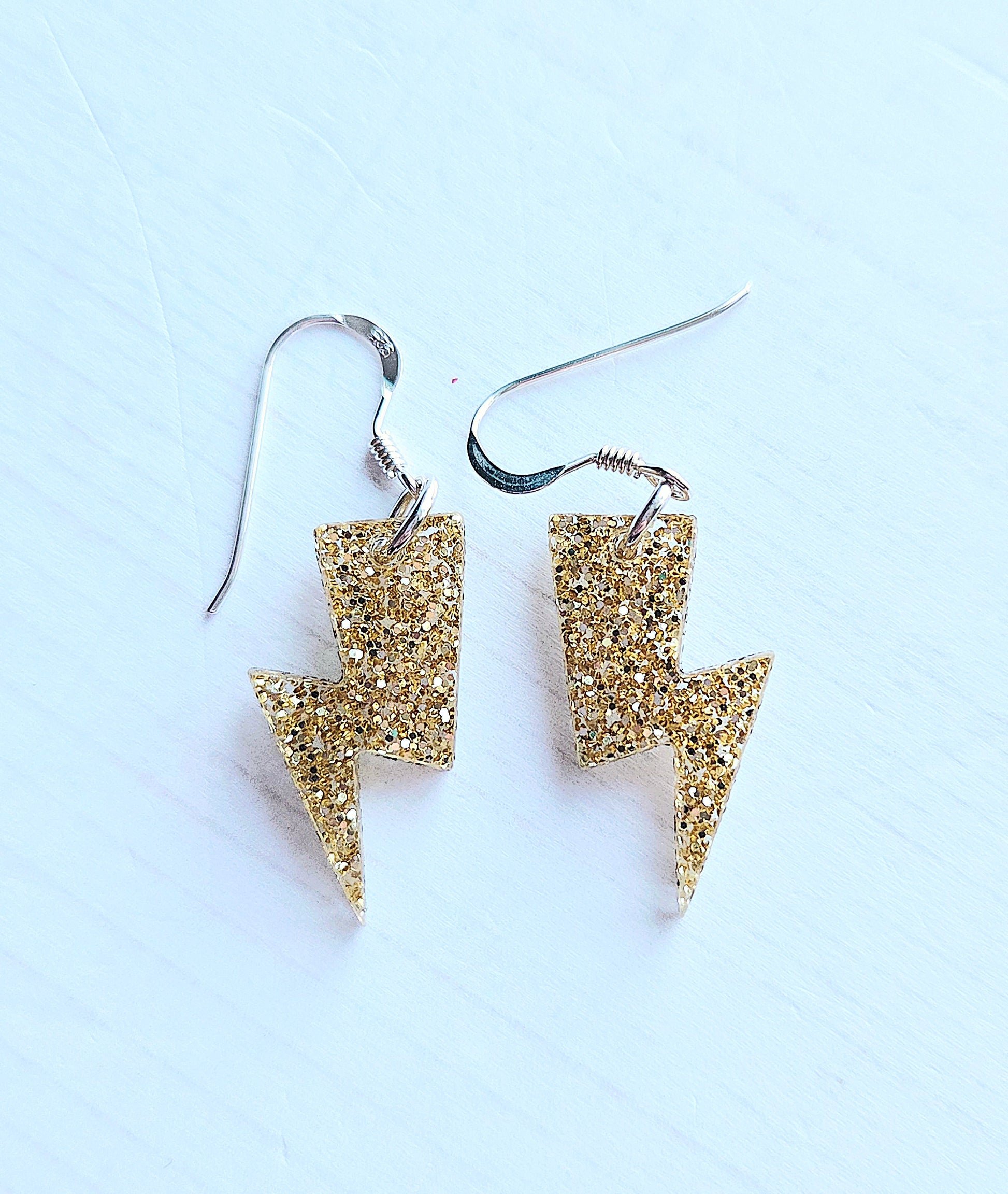 Lightning bolt drops earrings with sterling silver hooks, made from laser cut gold glitter acrylic