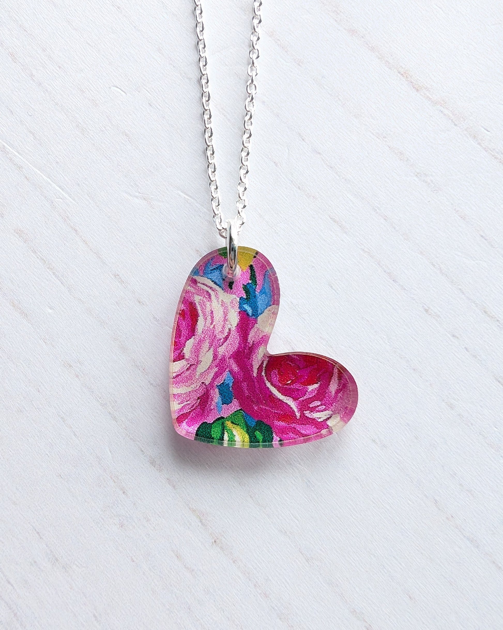 Gorgeous pendant made using a new Pink Roses print with green detail. Chain is 18" Sterling Silver