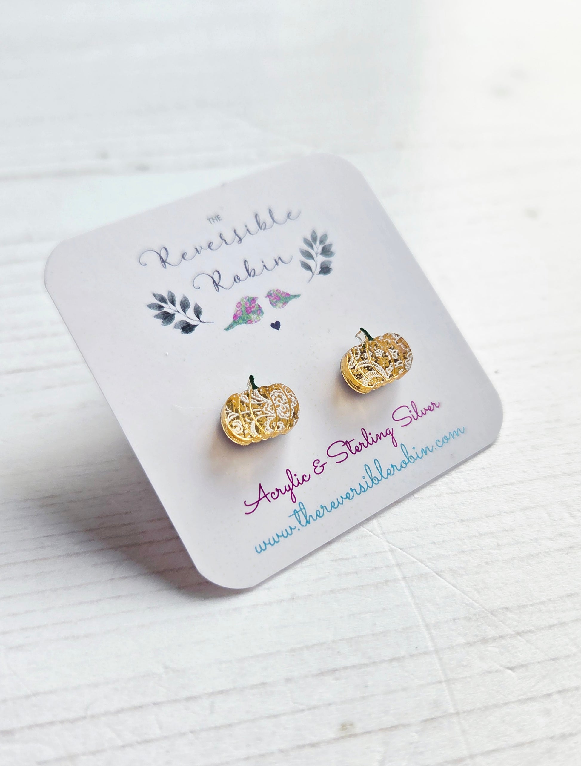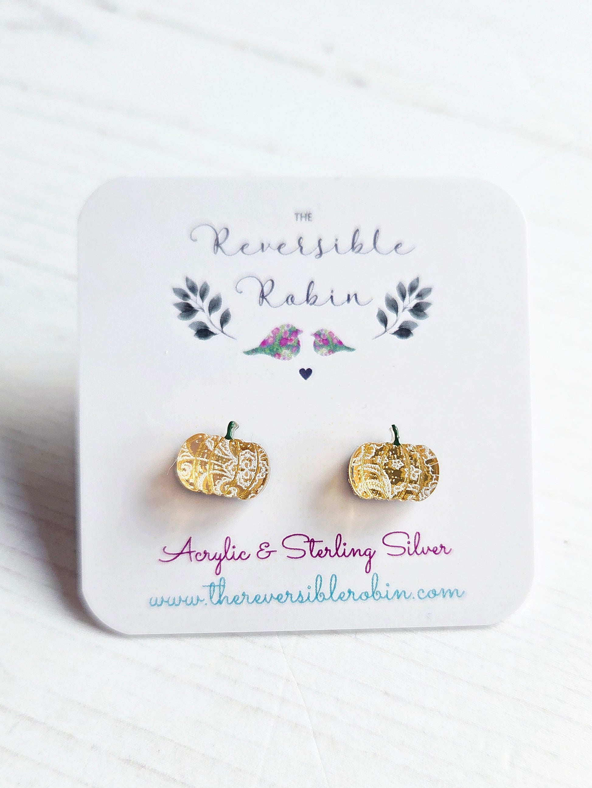 Gorgeous pumpkin studs made with a gold mirrored acrylic with a white lace print.