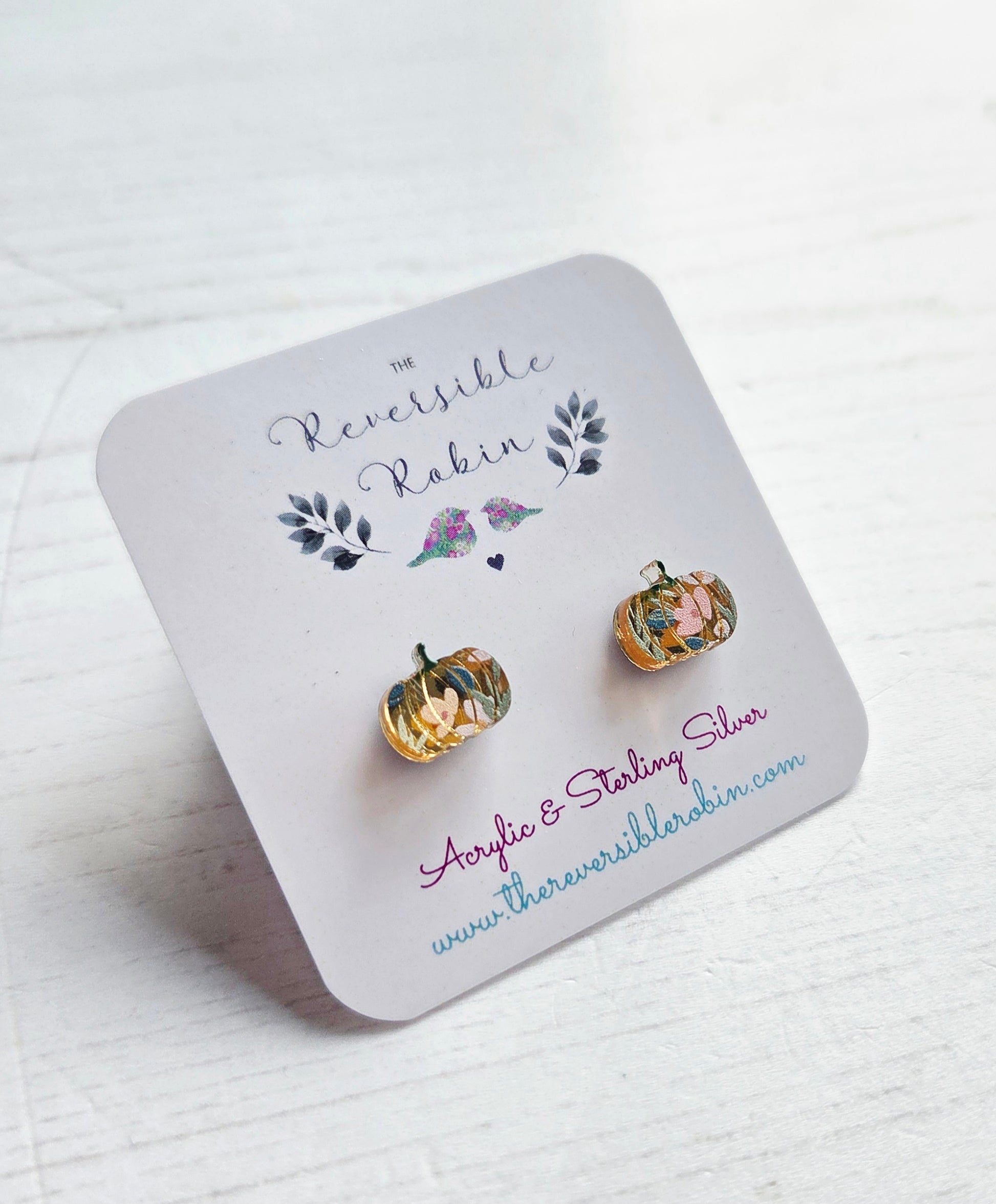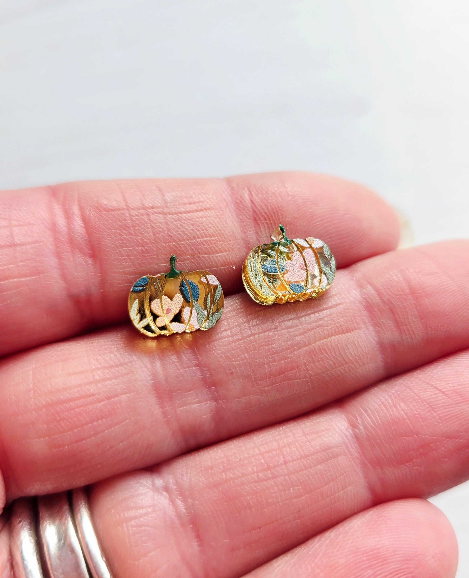 Cute pumpkin studs made from a yellow gold mirrored acrylic with floral print.