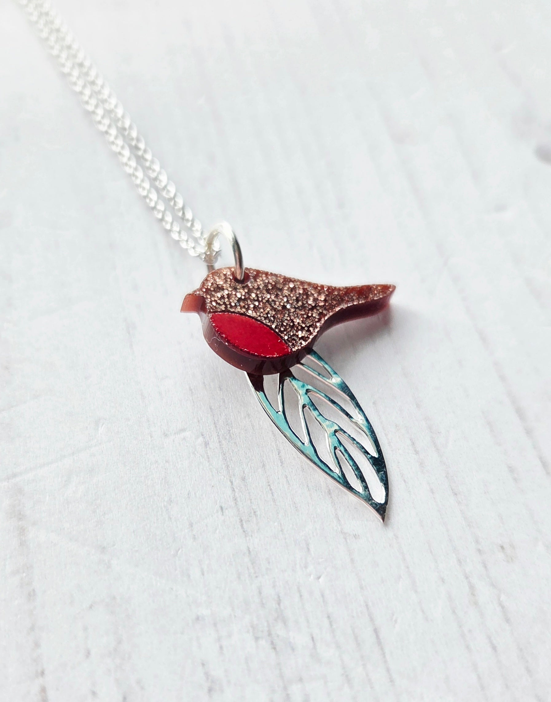 Gorgeous shimmer acrylic Robin with a sterling silver leaf charm on and 18" Sterling Silver chain