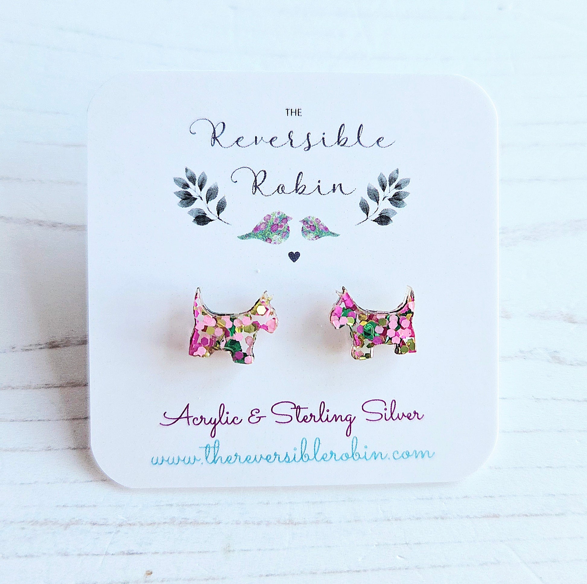 Fun pink green and gold glitter scottie studs with sterling silver posts