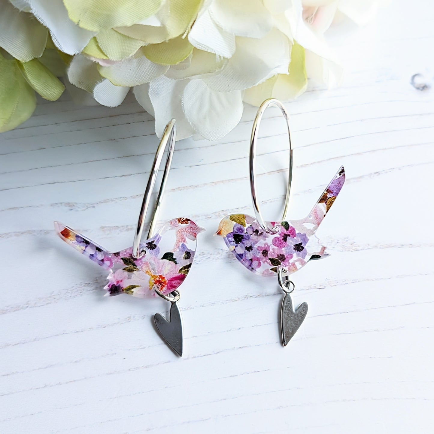 Wren statement hoop earrings with sterling silver heart and 30mm endless silver hoops. This beautiful lilac Floral pattern is printed on clear acrylic